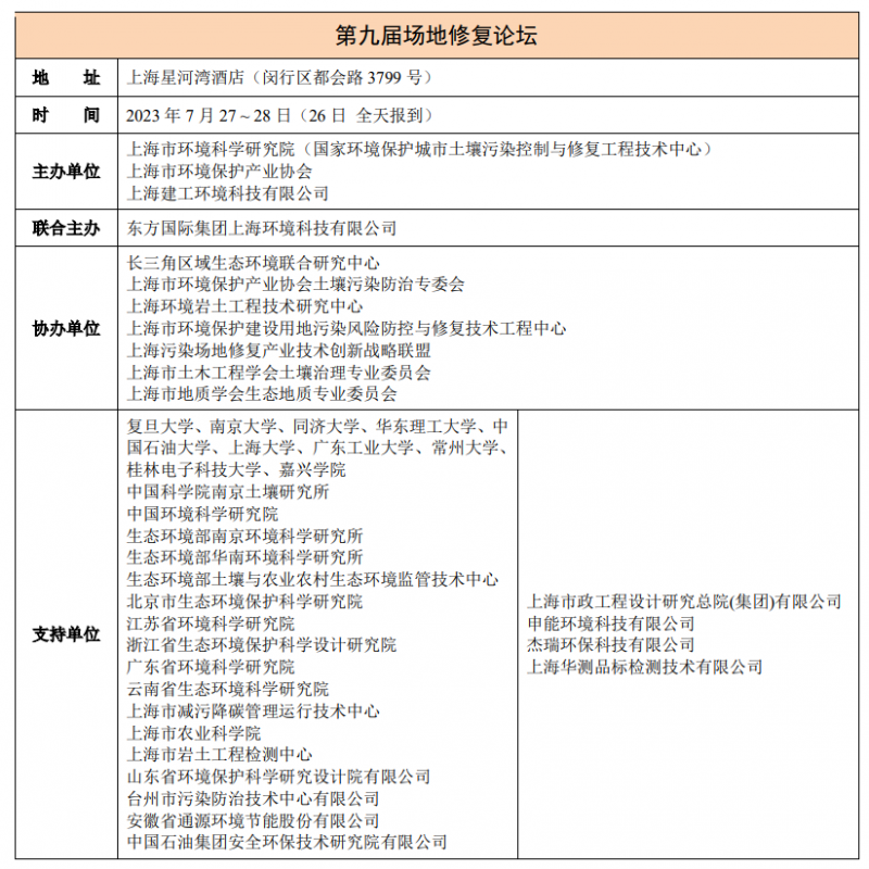 在论坛历经10载之际,“场地修复论坛”以全新的面貌再次亮相申城。本次论坛由上海市环境科学研究院(国家环境保护城市土壤污染控制与修复工程技术中心)、多多28、上海建工环境科技有限公司共同主办,以“科技赋能新时代场地修复行业高质量发展”为主题,定于2023年7月27-28日在上海星河湾酒店(闵行区都会路3799号)举行。本次论坛将围绕“最新政策法规解读及地方管理经验交流”、“国家重点研发计划创新成果”、“污染场地绿色可持续修复和创新模式实践”等议题为与会嘉宾分享高质量的报告并展开热烈的讨论。诚邀各有关单位和专家学者参会交流!