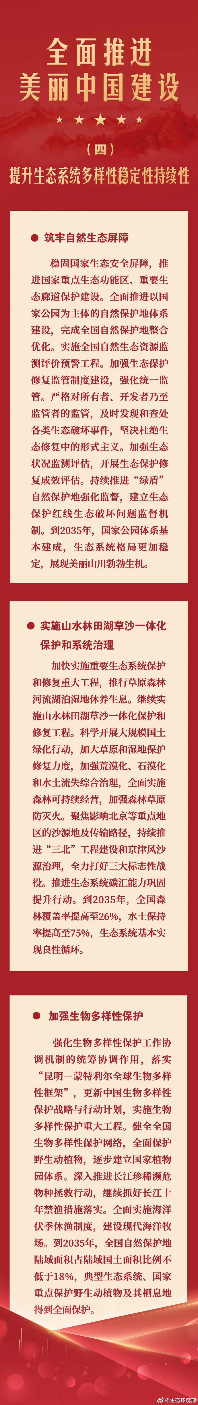 建设美丽中国是全面建设社会主义现代化国家的重要目标,是实现中华民族伟大复兴中国梦的重要内容。1月11日,《中共中央 国务院关于全面推进美丽中国建设的意见》发布。意见分为10章共33条,提出未来5年和到2035年美丽中国建设的主要目标、重大任务和重大改革措施,是指导全面推进美丽中国建设的纲领性文件。