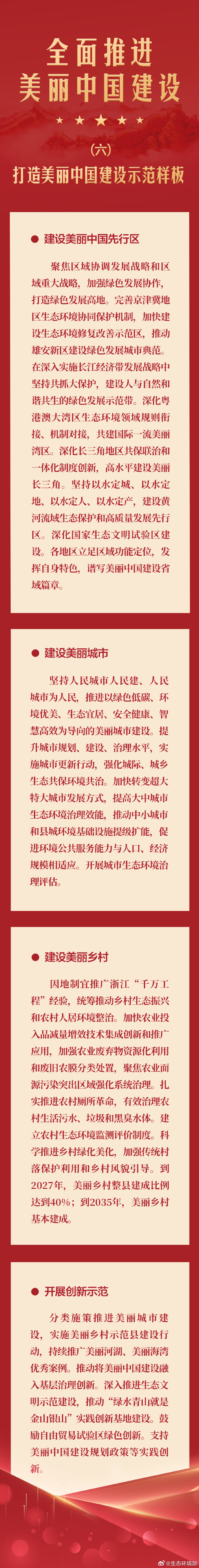 建设美丽中国是全面建设社会主义现代化国家的重要目标,是实现中华民族伟大复兴中国梦的重要内容。1月11日,《中共中央 国务院关于全面推进美丽中国建设的意见》发布。意见分为10章共33条,提出未来5年和到2035年美丽中国建设的主要目标、重大任务和重大改革措施,是指导全面推进美丽中国建设的纲领性文件。