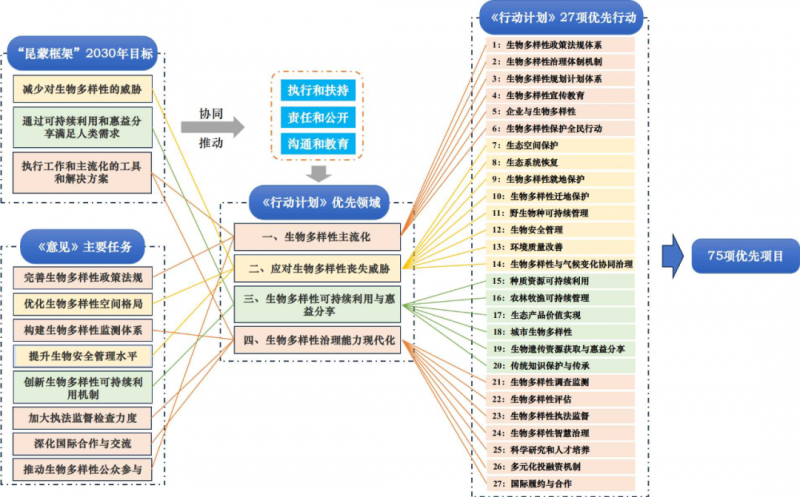 在支撑保障层面,《行动计划》提出了成立生物多样性专家咨询委员会和各地生物多样性保护专家库、加强基础科学和应用技术研究及成果转化等科技支撑建议,推动将生物多样性项目纳入生态环保金融支持项目储备、灵活运用多种形式的生态环境导向的开发模式和金融支持政策等资金保障建议。