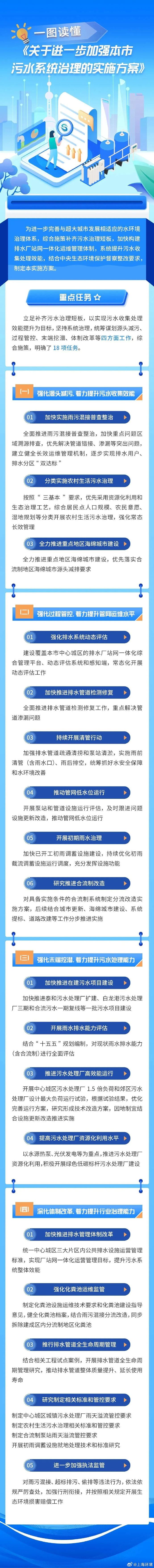 为进一步完善与超大城市发展相适应的水环境治理体系,综合施策补齐污水治理短板,加快构建排水厂站网一体化运维管理体制,系统提升污水收集处理效能,结合中央生态环境保护督察整改要求,市政府办公厅近日印发《关于进一步加强本市污水系统治理的实施方案》。《实施方案》重点任务包括强化源头减污,着力提升污水收集效能;强化过程管控,着力提升管网运维水平;强化末端挖潜,着力提升污水处理能力;深化体制改革,着力提升行业治理能力等四方面18项任务。详见图解↓ (来源:上海水务海洋)