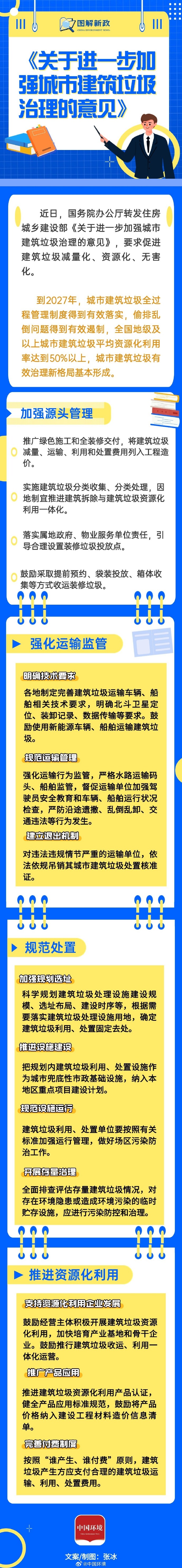 图解新政丨遏制建筑垃圾偷排乱倒,新规来了!】近日,国务院办公厅转发住房城乡建设部《关于进一步加强城市建筑垃圾治理的意见》,要求促进建筑垃圾减量化、资源化、无害化。意见提出,到2027年底前,健全城市建筑垃圾治理体系,完善建筑垃圾法规政策和标准规范。