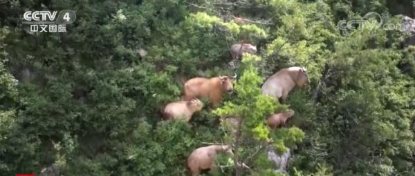 陕西:无人机记录下羚牛群在崖壁悠闲吃草