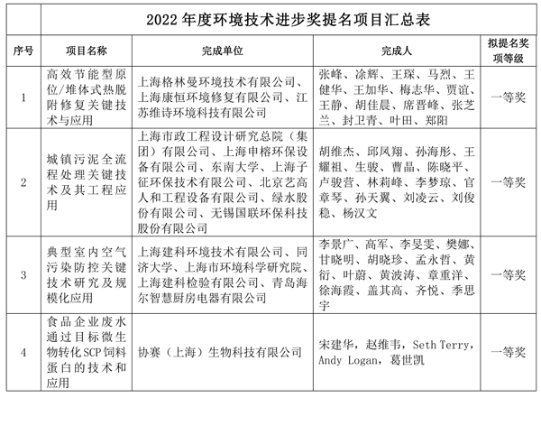 附件:2022年度环境技术进步奖提名项目汇总表