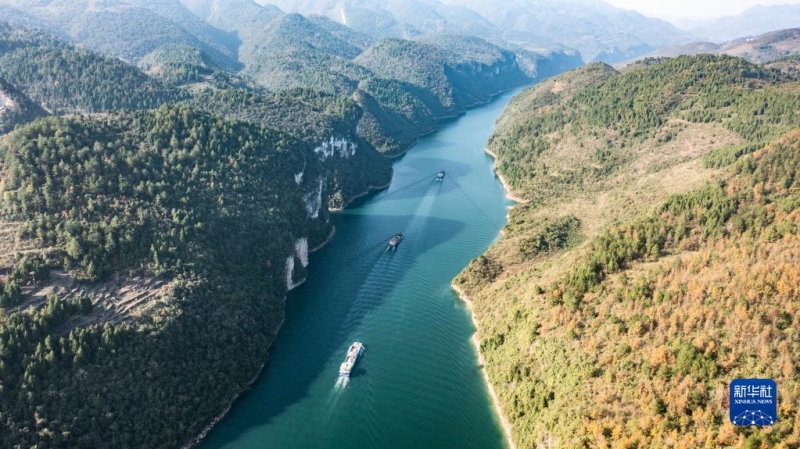 运载磷矿石的货船沿乌江航道顺流航行(2021年11月18日摄,无人机照片)。 新华社记者 陶亮 摄