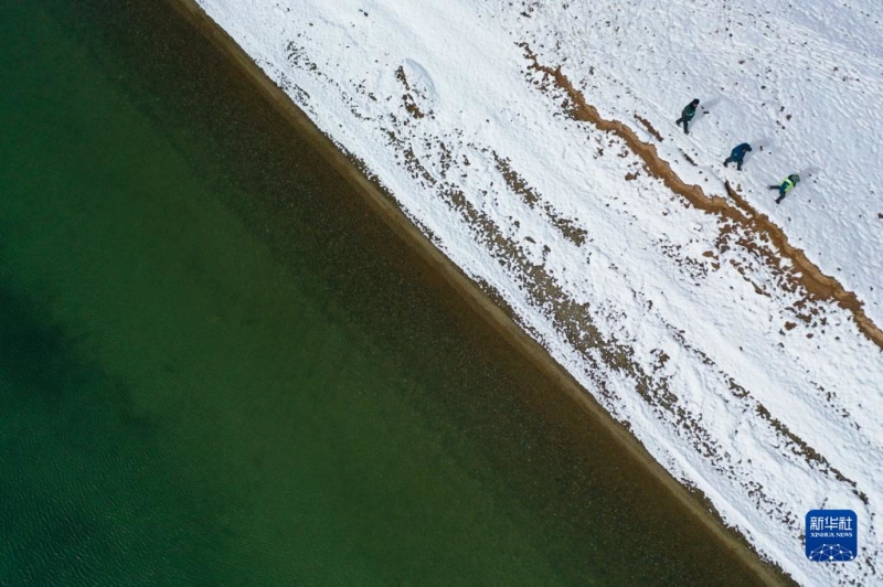 在青海省果洛藏族自治州玛多县扎陵湖乡勒那村,三江源国家公园黄河源园区生态管护员在巡护(2021年10月20日摄,无人机照片)。 新华社记者 张龙 摄