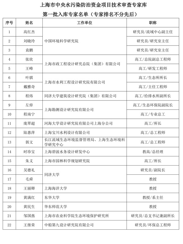 现发布上海市中央水污染防治资金项目技术审查专家库名单(第一批)。