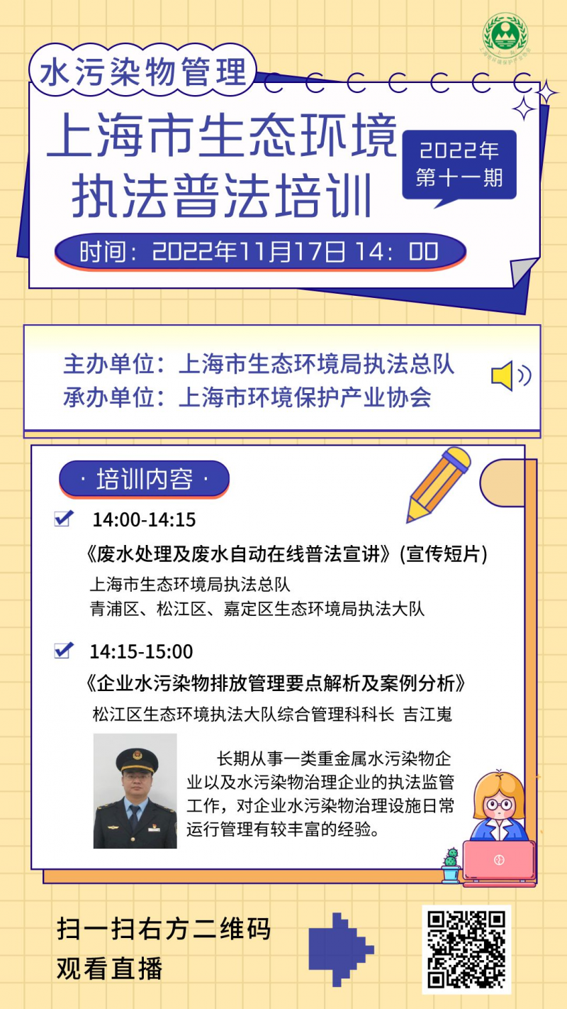 为普及水污染物治理相关法律规范,加强排污企业废水处理现场及废水自动在线监测监控设施的规范管理,增强排污企业主体责任意识,提升排污企业依法治污的能力,由上海市生态环境局执法总队主办、多多28承办的上海市生态环境执法普法培训(2022年第十一期)即将开班。