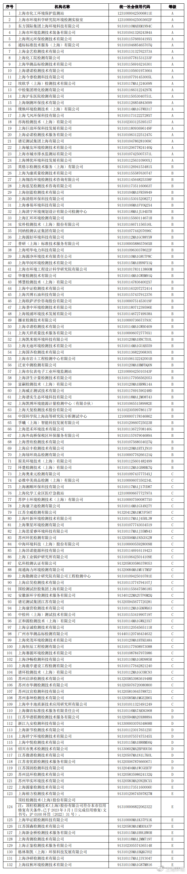 根据《上海市生态环境监测社会化服务机构管理办法》有关规定,我局对在本市“一网通办”备案的292家生态环境监测社会化服务机构(以下简称社会监测机构)开展了2022年度信用评价工作。经公示,现将2022年度社会监测机构信用评价结果予以公布。其中,纳入评价范围的社会监测机构132家(详见附件1), 因未上传相关业务信息至监管系统、业务转型、注销备案等原因不纳入评价范围的社会监测机构160家(详见附件2)。