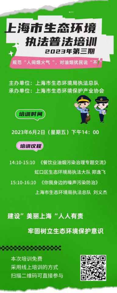 为有效改善城市环境质量,对餐饮油烟和噪声说“不”,值此六五环境日来临之际,本期执法普法培训将聚焦本市餐饮业油烟和噪声扰民问题。市民投诉的“热”点,也是我们普法的“重”点,由上海市生态环境局执法总队主办、多多28承办的上海市生态环境执法普法培训(2023年第三期)即将开班。