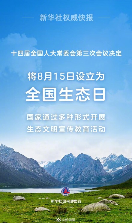 6月28日,十四届全国人大常委会第三次会议决定:将8月15日设立为全国生态日。国家通过多种形式开展生态文明宣传教育活动。