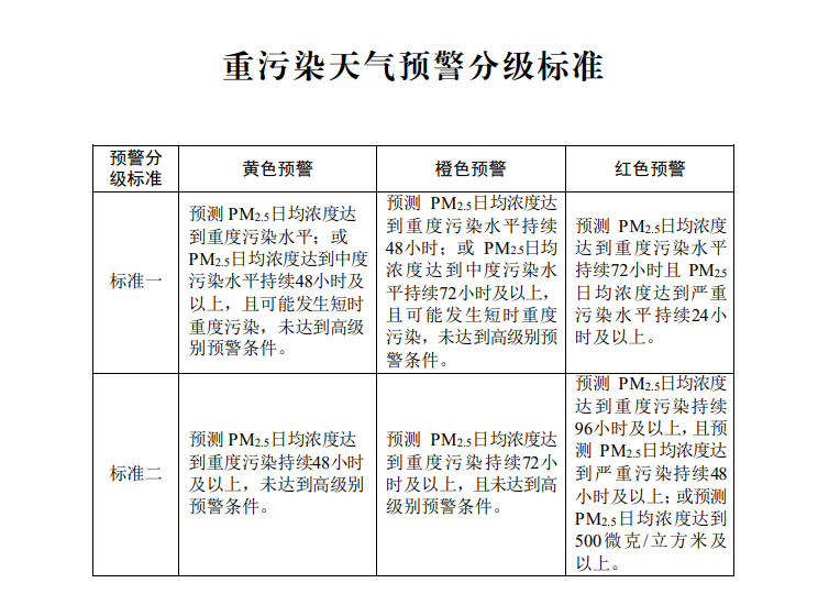 图为重污染天气预警分级标准附表。