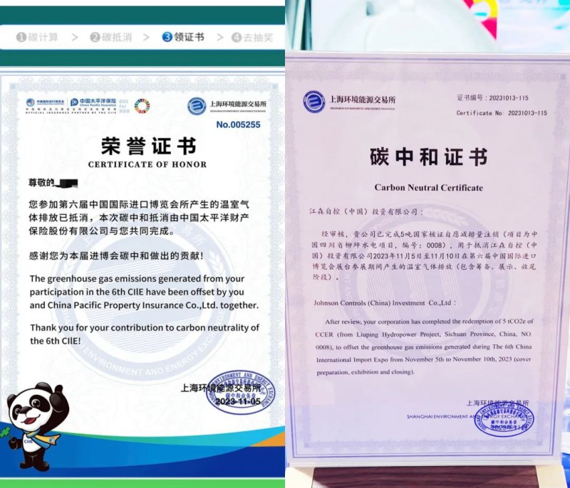 “经审核,贵公司已完成5吨国家核证自愿减排量注销(项目为中国四川省柳坪水电项目,编号:0008),用于抵消江森自控(中国)投资有限公司2023年11月5日—11月10日在第六届中国国际进口博览会展台参展期间产生的温室气体排放(包括筹备、展示、收尾阶段)。”一份来自上海环境能源交易所的“碳中和证书”展示在进博会现场。