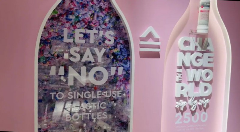 在倍世展区,粉色的墙面里镶嵌着无数一次性使用过的塑料瓶,以英文标语“Let’s say ‘NO’to single use plastic bottles”(让我们对一次性使用塑料瓶说不)呼吁人们关注塑料污染。