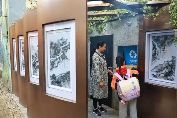 垃圾箱房内有智能感应投放门,垃圾箱房外是水墨画屏风。周馨 摄