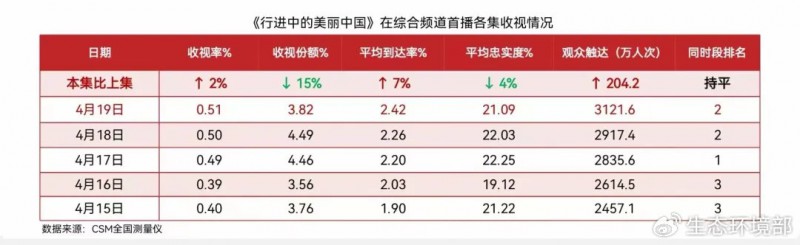 开播以来,《行进中的美丽中国》广受关注和好评,收视取得佳绩。截至2024年4月19日,首播5集平均收视率0.46%,收视份额4.02%,同时段全国上星频道排名第1位,首播累计触达观众1.4亿人次。