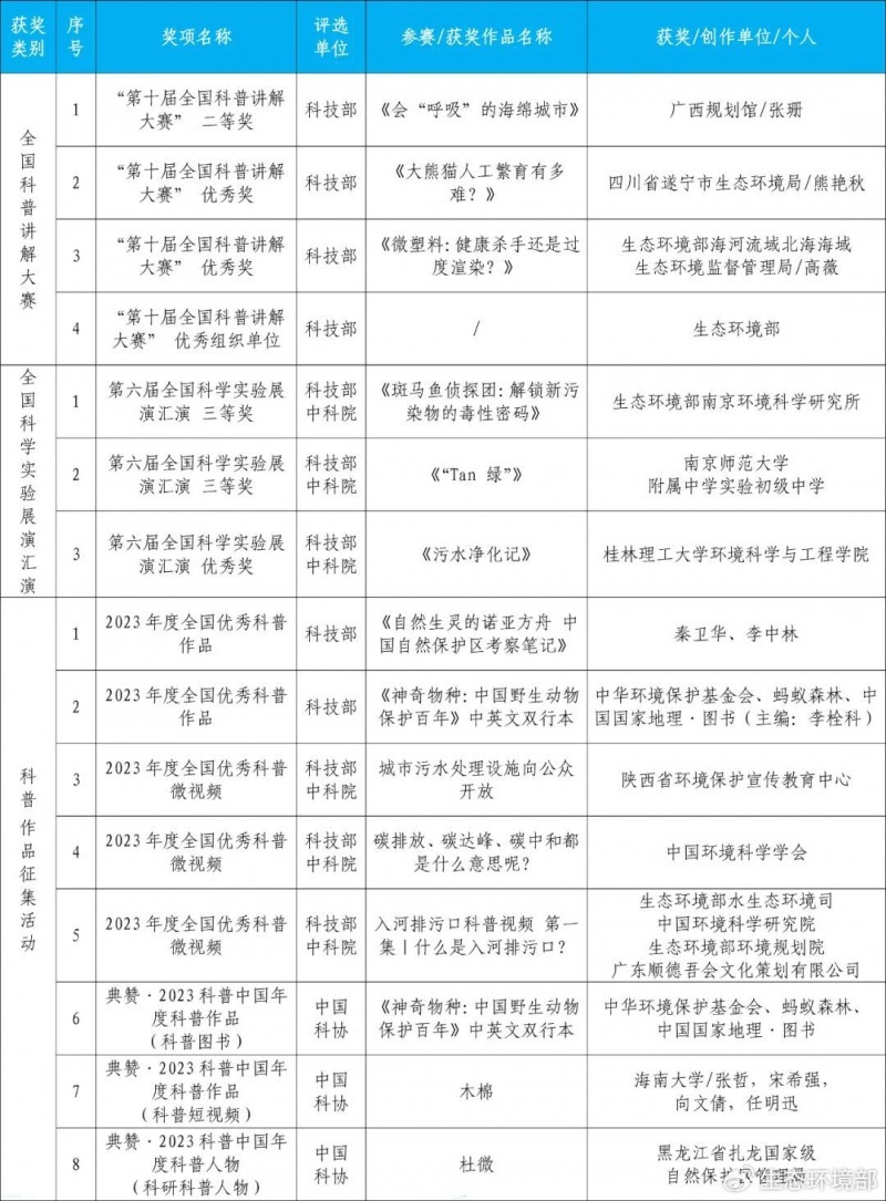 2023年,生态环境部创新开展生态环境科技成果科普化典型案例和优秀科普作品征集活动,遴选出的《自然生灵的诺亚方舟 中国自然保护区考察笔记》等5项作品荣获科技部优秀科普作品(微视频),《神奇物种:中国野生动物保护百年》中英文双行本等3项作品(人物)获得中国科协“典赞·2023科普中国”提名,获奖数量较往年大幅提升。
