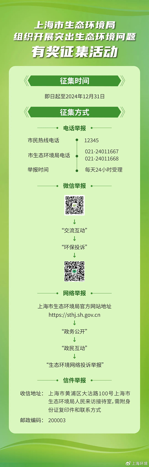 ◆ 信件举报,市民可通过写信方式提供突出生态环境问题线索,收信地址为上海市黄浦区大沽路100号上海市生态环境局人民来访接待室,邮编为200003,需附身份证复印件和联系方式。