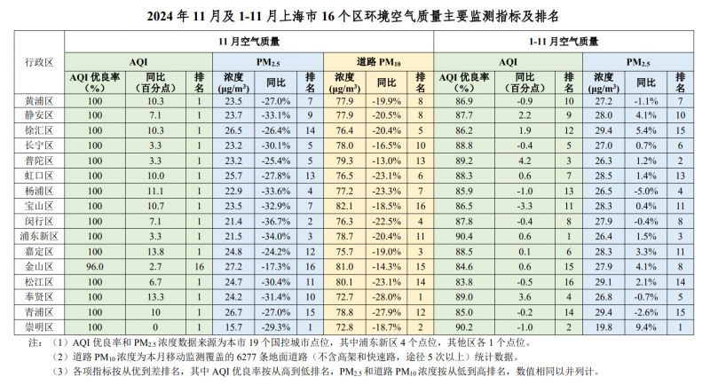 11月全市共有15个区AQI优良率为100%;金山区11月3日受局地气象条件影响出现臭氧轻度污染,11月AQI优良率为96.0%。
