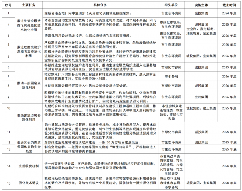 2024年底前,完成老港基地厂内中温回炉飞灰资源化项目试点数据采集。2025年,本市全面启动生活垃圾焚烧飞灰厂内资源化利用改造,对个别不具备厂内飞灰资源化改造条件的,研究采取钢铁炉窑协同处置、高温熔融等多种资源化路径。2026年底前,资源化利用设施稳定投产,生活垃圾焚烧飞灰实现零填埋。