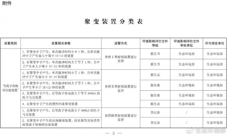三、基于不同类型聚变装置的辐射安全风险,我部对聚变装置进行分类管理(见附件),与现行辐射管理要求有效衔接,便于建设单位根据相应的类别办理环境影响评价手续。我部将实行环境影响评价与辐射安全许可接续办理,探索开展环境影响评价与辐射安全许可“审评合一”。