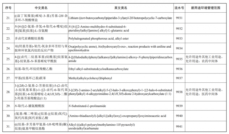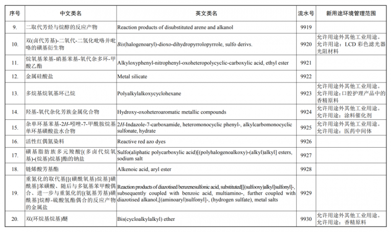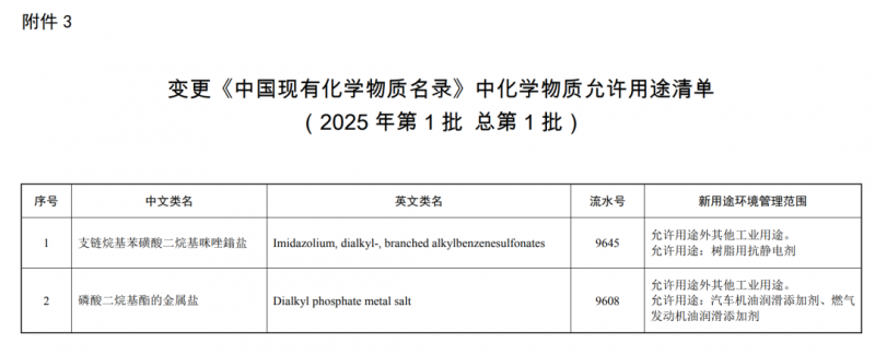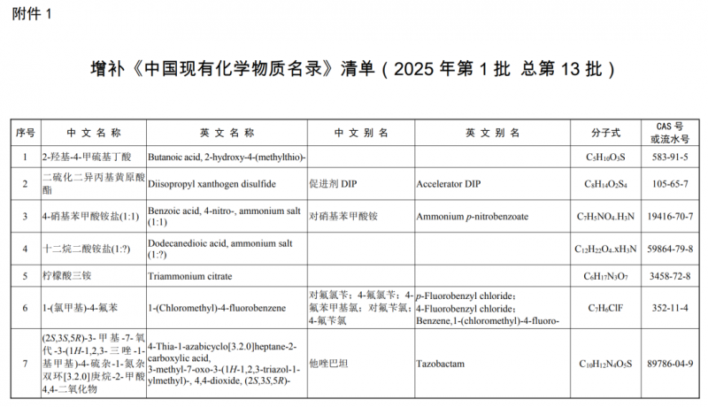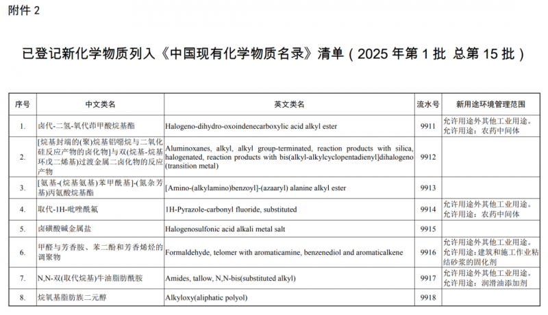 根据《新化学物质环境管理登记办法》(生态环境部令第12号)及其配套文件的相关规定,现发布增补《中国现有化学物质名录》清单(2025年第1批 总第13批)、已登记新化学物质列入《中国现有化学物质名录》清单(2025年第1批 总第15批)、变更《中国现有化学物质名录》中化学物质允许用途清单(2025年第1批 总第1批)。