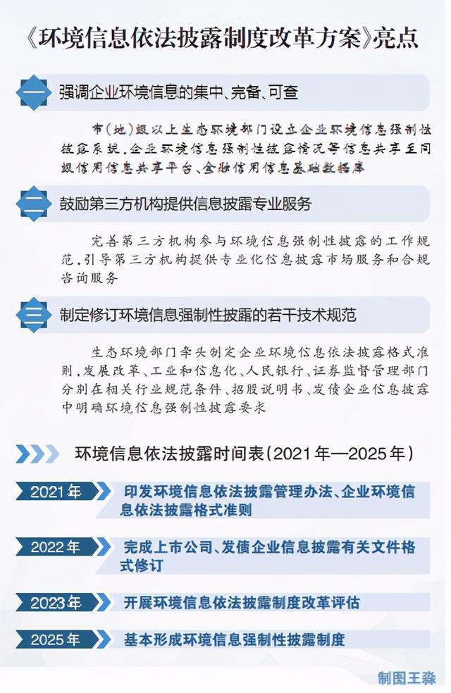 按照时间表要求,2021年,印发环境信息依法披露管理办法、企业环境信息依法披露格式准则。2022年,完成上市公司、发债企业信息披露有关文件格式修订。2023年,开展环境信息依法披露制度改革评估。2025年,基本形成环境信息强制性披露制度。