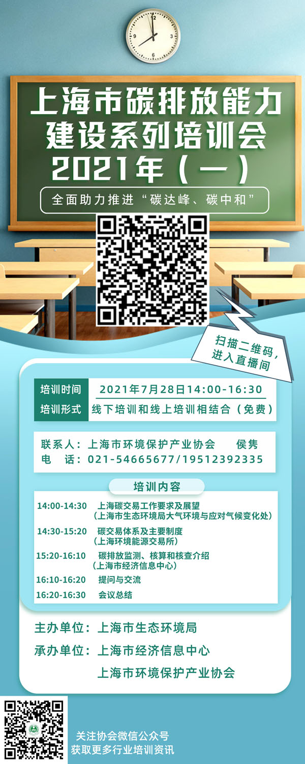 2021年第一期培训将于2021年7月28日下午举行。培训会将采用线下和线上相结合的培训方式,主要针对《上海碳交易工作要求及展望》、《碳交易体系及主要制度》和《碳排放监测、核算和核查介绍》等内容进行深入透彻的讲解和培训。扫描二维码可直接参与线上培训。
