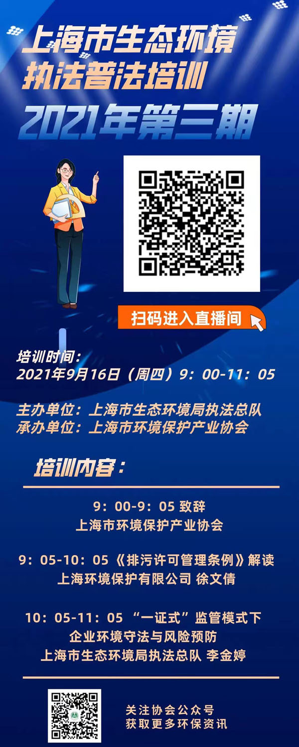 《排污许可管理条例》已于2021年3月1日起正式施行,为加强条例宣贯及持证单位证后管理,上海市生态环境局执法总队现开展上海市生态环境执法普法系列培训会(2021年第三期)。
