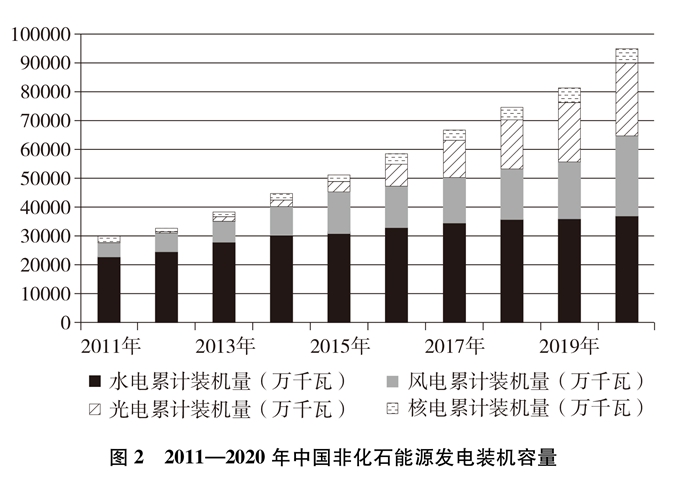 非化石能源快速发展。中国把非化石能源放在能源发展优先位置,大力开发利用非化石能源,推进能源绿色低碳转型。初步核算,2020年,中国非化石能源占能源消费总量比重提高到15.9%,比2005年大幅提升了8.5个百分点;中国非化石能源发电装机总规模达到9.8亿千瓦,占总装机的比重达到44.7%,其中,风电、光伏、水电、生物质发电、核电装机容量分别达到2.8亿千瓦、2.5亿千瓦、3.7亿千瓦、2952万千瓦、4989万千瓦,光伏和风电装机容量较2005年分别增加了3000多倍和200多倍。非化石能源发电量达到2.6万亿千瓦时,占全社会用电量的比重达到三分之一以上。