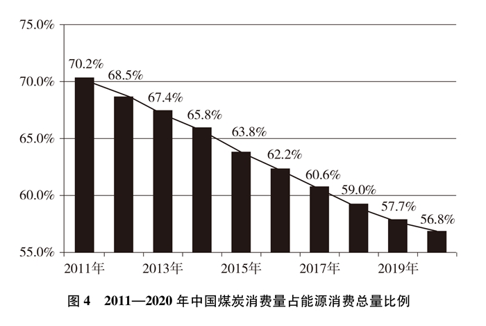 能源消费结构向清洁低碳加速转化。为应对化石能源燃烧所带来的环境污染和气候变化问题,中国严控煤炭消费,煤炭消费占比持续明显下降。2020年中国能源消费总量控制在50亿吨标准煤以内,煤炭占能源消费总量比重由2005年的72.4%下降至2020年的56.8%。中国超额完成“十三五”煤炭去产能、淘汰煤电落后产能目标任务,累计淘汰煤电落后产能4500万千瓦以上。截至2020年底,中国北方地区冬季清洁取暖率已提升到60%以上,京津冀及周边地区、汾渭平原累计完成散煤替代2500万户左右,削减散煤约5000万吨,据测算,相当于少排放二氧化碳约9200万吨。
