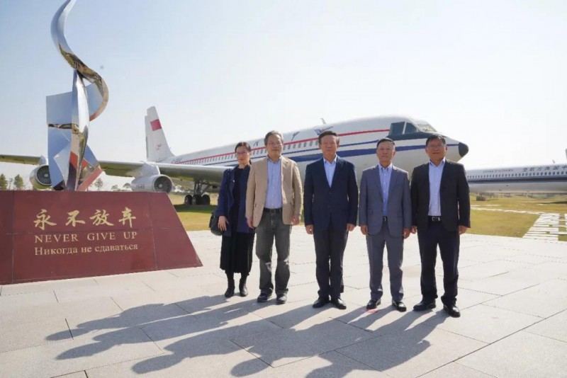 郭承站会长与部分在沪理事在运十飞机和“永不放弃”雕塑前合影
